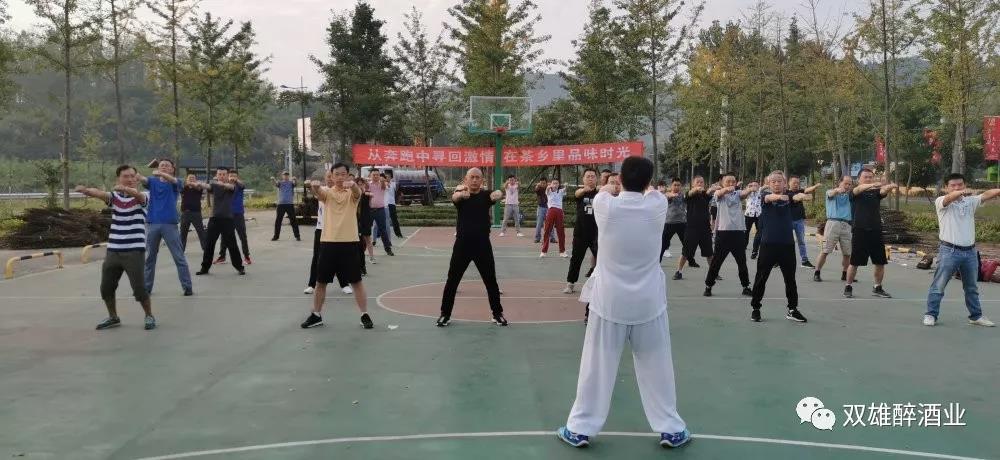 8日清晨,大家在玉皇劍莊園前的籃球場上,在鄭總帶領(lǐng)下,一起練習(xí)武當(dāng)養(yǎng)生功,初秋,涼風(fēng)習(xí)習(xí),空氣清新,大家吐納開合,一招一式透出力量與精神,功課練完,汗?jié)褚陆螅瑹o不覺得神清氣爽。鄭總說,各位老板每日應(yīng)酬很多,多年來嚴重透支身體健康,練養(yǎng)生功的目的就是要提高我們身體的自愈修復(fù)功能,練功要堅持才能達到效果,雙雄醉健康酒業(yè)不僅為大家提供健康的白酒,還要倡導(dǎo)健康的生活方式。