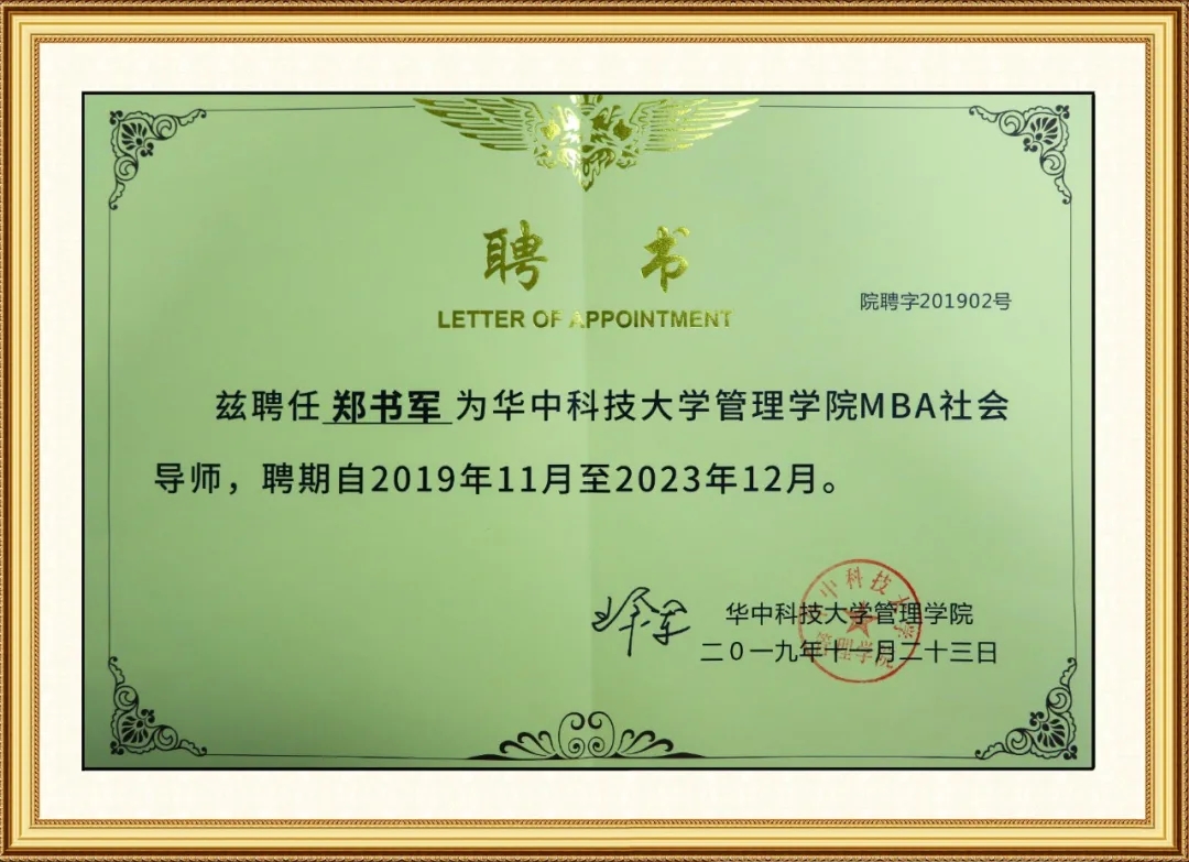 總經(jīng)理鄭書軍被特聘為華中科技大學(xué)管理學(xué)院MBA社會(huì)學(xué)導(dǎo)師