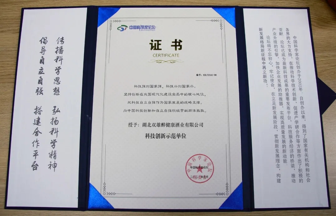 2020年底,總經(jīng)理鄭書軍撰寫的《淺論新時期傳統(tǒng)白酒面臨的挑戰(zhàn)與健康白酒的發(fā)展方向——兼談湖北雙雄醉健康酒業(yè)的探索與實踐——》論文在國內(nèi)多家專業(yè)刊物發(fā)表,并被翻譯成英文在國外媒體廣為傳播,引發(fā)國外同行關(guān)注,論文從中國白酒發(fā)展簡史簡述,講到白酒與生命健康之間的關(guān)系,再到白酒對人體精神能量的影響,探索新時期白酒突圍的方向,落實到雙雄醉健康酒業(yè)對健康白酒的探索與實踐。用相對通俗的科普方式幫助消費者了解白酒的起源、白酒的健康因子、怎樣適度飲用等基本常識,向世界推薦中國,推廣中國文化和健康飲品。中國科學家論壇授予了雙雄醉健康酒業(yè)總經(jīng)理鄭書軍,“中國科學家論壇科學與技術(shù)創(chuàng)新先進個人”的表彰并頒發(fā)了獎牌和榮譽證書。