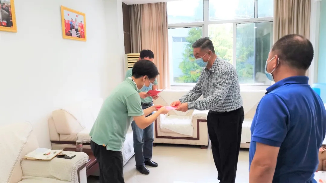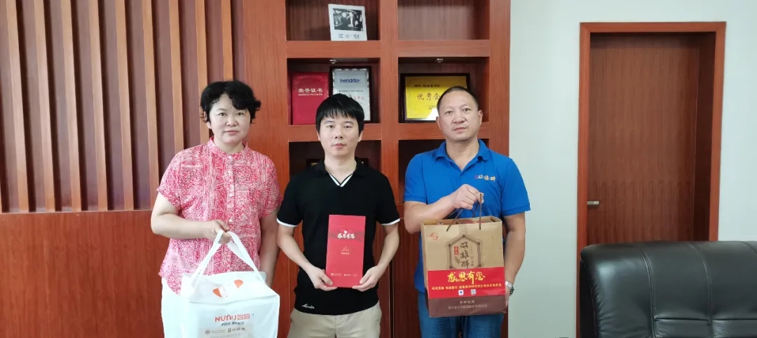 8月16日,在襄陽企聯(lián)常務副會長兼秘書長趙樂成帶領下,數(shù)據(jù)部部長劉輝、雙雄醉健康酒業(yè)大客戶服務部總監(jiān)李愛軍,來到湖北回天新材料股份有限公司,為湖北基地總經(jīng)理張亞、集團副總韓林贈送盛滿了關愛的愛心蛋糕、賀卡以及雙雄醉頂級酒——清罇優(yōu)醬。