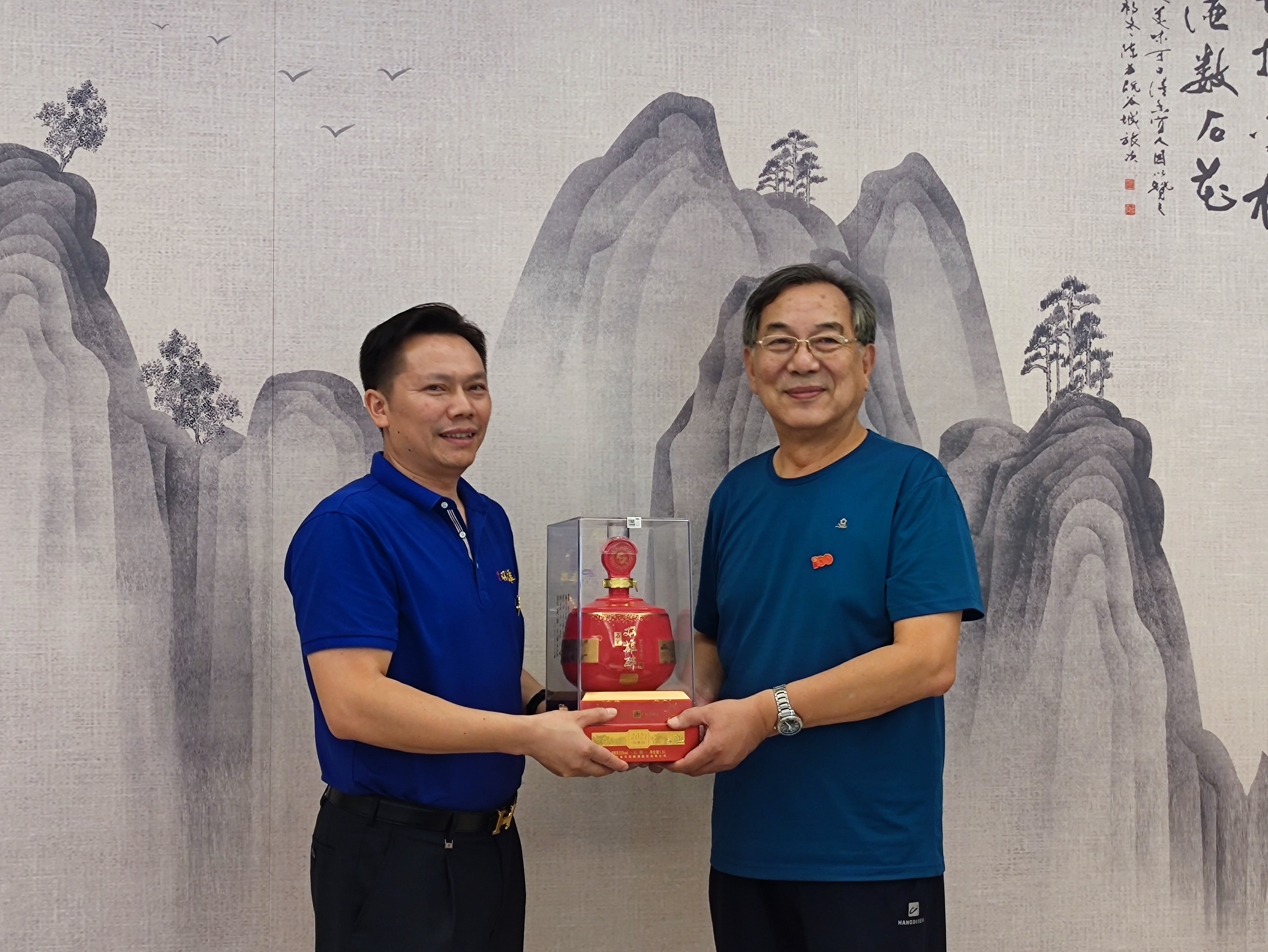 雙雄醉總經(jīng)理鄭書軍向畢老師贈送雙雄醉2021限量版紀念酒