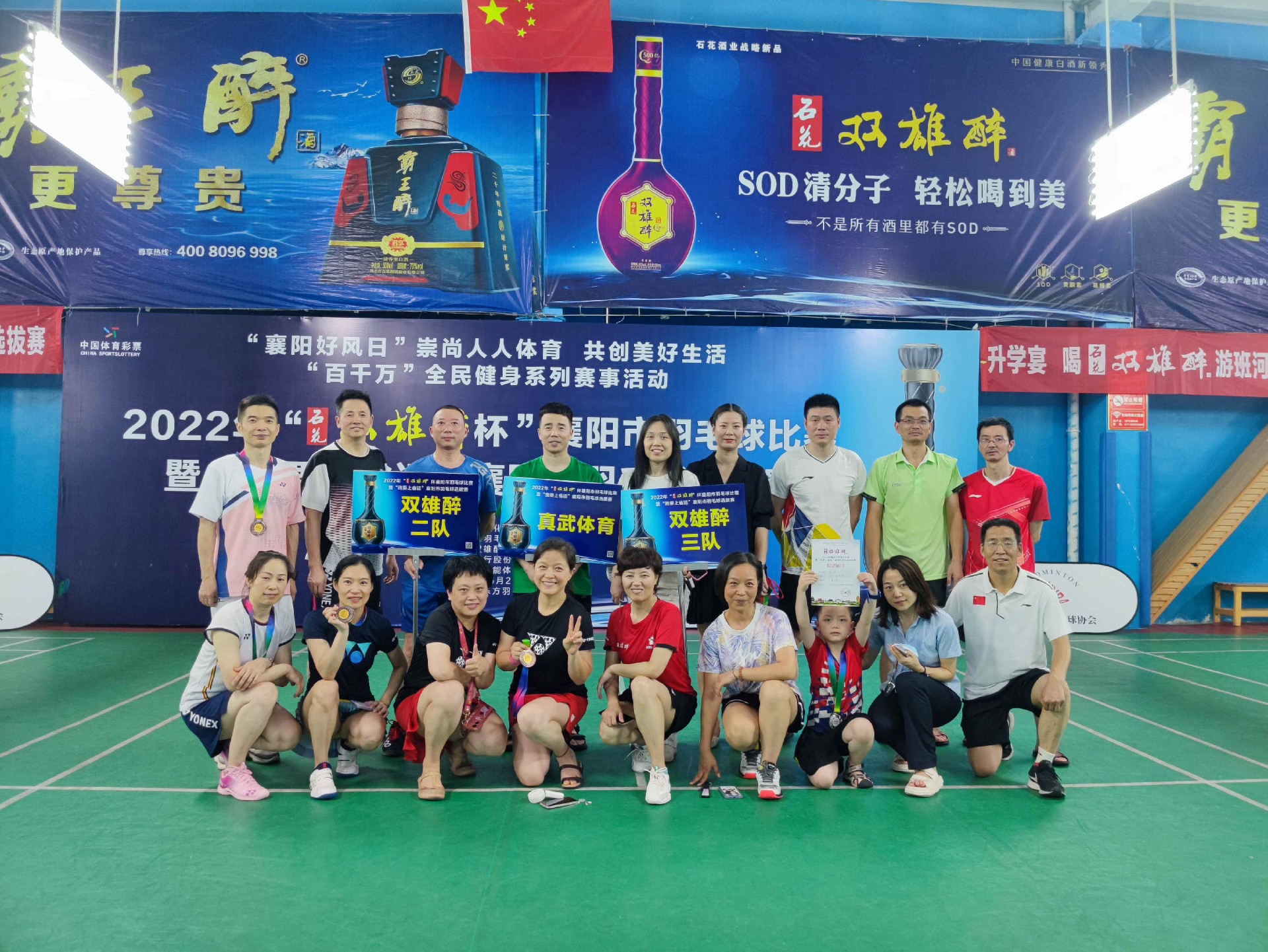 經(jīng)過(guò)兩天的角逐,本次羽毛球比賽也在歡呼聲中落下帷幕,經(jīng)過(guò)比賽排名后,為運(yùn)動(dòng)員頒發(fā)獎(jiǎng)牌以及由雙雄醉提供的富含SOD的健康白酒作為獎(jiǎng)品,值得一提的是,雙雄醉羽毛球代表一隊(duì)、二隊(duì)和三隊(duì)分別榮獲了混合團(tuán)體賽冠軍、季軍以及第五名的優(yōu)異成績(jī),為所有拼搏的運(yùn)動(dòng)員點(diǎn)贊,干杯雙雄醉!
