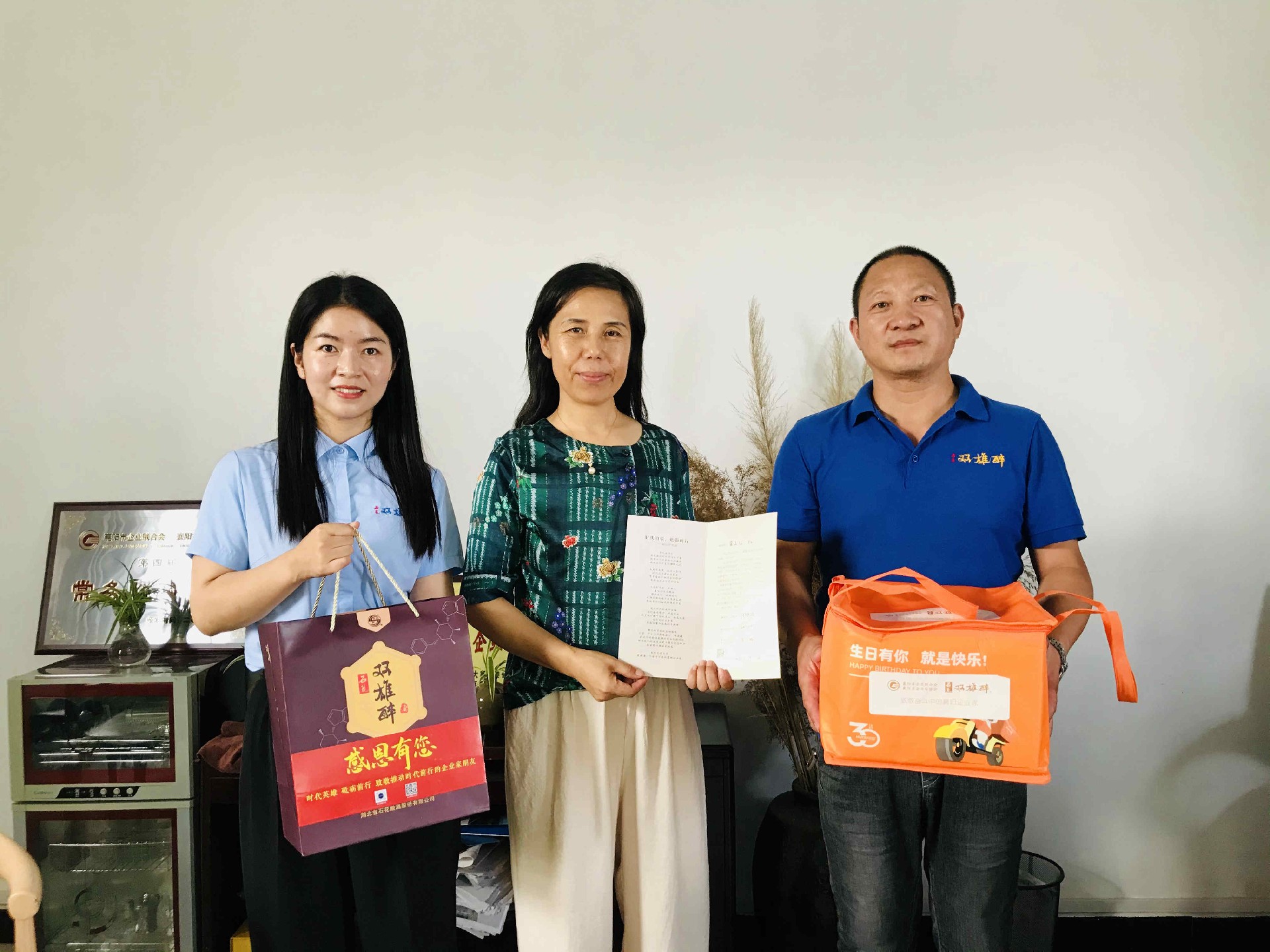 7月13日,襄陽企聯(lián)和石花雙雄醉得知湖北統(tǒng)訊智能科技有限公司李堅總經(jīng)理的生日后,便準備了由襄陽市領導付勁松副市長、市經(jīng)信局楊富杰局長和市企聯(lián)吳少偉會長簽名的《襄陽英雄 青春永駐》的生日賀卡、生日蛋糕以及雙雄醉含有SOD的健康酒,為李總舉辦一個有儀式感的生日。