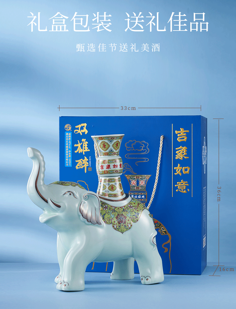 佳節(jié)暢飲雙雄醉,吉象如意帶回家。大象自古就是靈獸,象諧音祥、相,寓意著吉祥如意、出將入相,靈象現(xiàn)世則天下太平。